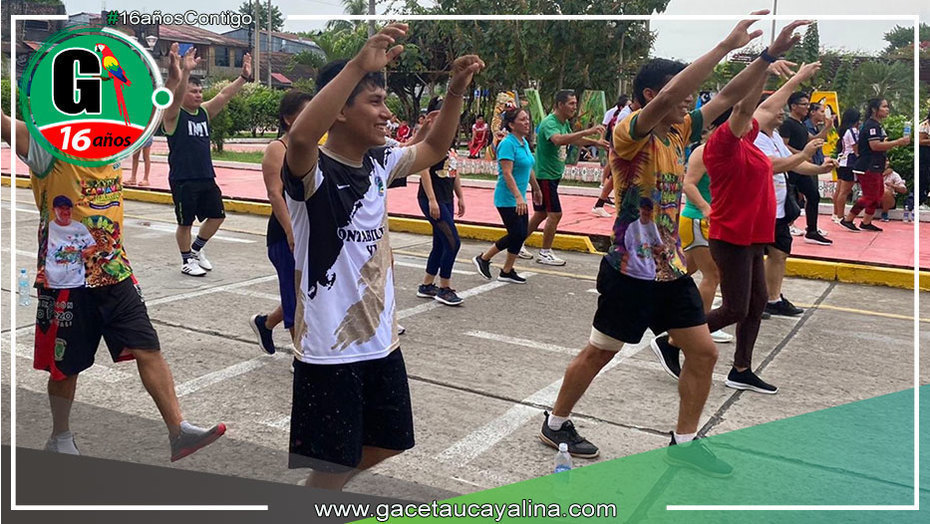 Las actividades se llevaron a cabo en el frontis de la municipalidad, iniciando con ejercicios de calentamiento, estiramientos y aeróbicos.