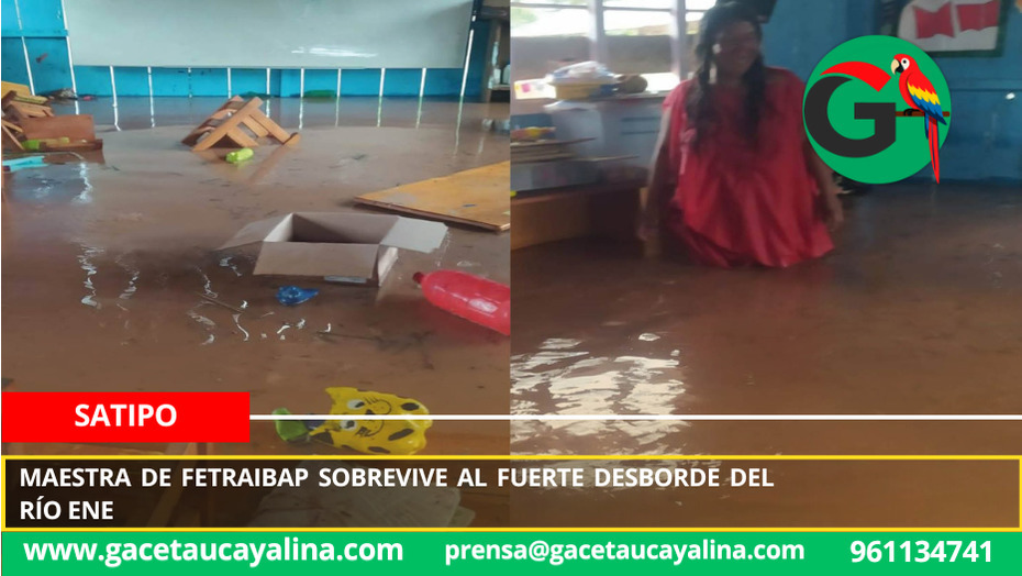 Satipo.- El desborde del río Ene en la comunidad nativa de Tincaveni, ubicada en el distrito de Río Tambo (provincia de Satipo, región Junín), dejó a su paso graves daños materiales y puso en riesgo la vida de una docente perteneciente a la FETRAIBAP (Federación de Trabajadores en la Educación Intercultural Bilingüe de la Amazonía Peruana), quien se desempeña en la Institución Educativa de Tincaveni.