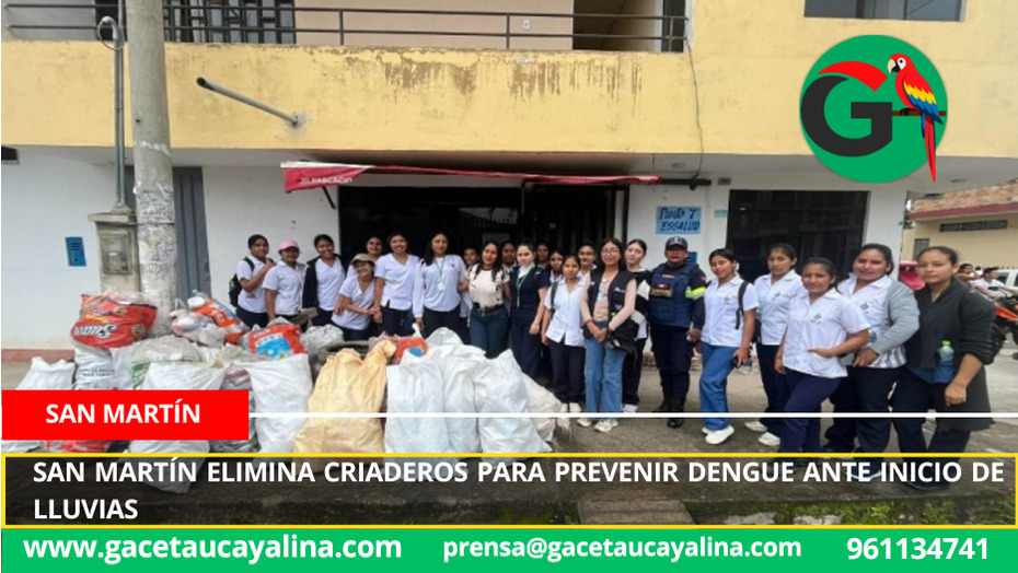 San Martín.- Ante el inicio de la temporada de lluvias y con el objetivo de evitar la reproducción del zancudo Aedes aegypti, principal transmisor del dengue, el Ministerio de Salud (Minsa), por medio de la Dirección Regional de Salud (Diresa) San Martín, realizó una gran campaña de limpieza en la provincia de Moyobamba, donde se lograron eliminar 20.7 toneladas de criaderos de zancudos.