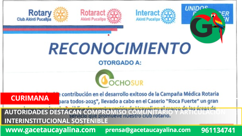Durante la campaña médica, Linder Ramírez, presidente del Rotary Club Akinti Pucallpa, distinguió a la palmicultora Ocho Sur por su invaluable contribución en el desarrollo exitoso de la Campaña Médica Rotaria de Roca Fuerte “Salud Integral para todos-2025”, un gran logro para la salud pública de la región de Ucayali.