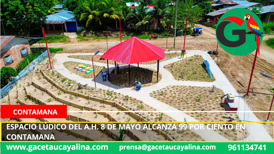 Contamana / Ucayali / Loreto.- La Municipalidad Provincial de Ucayali anunció que el nuevo espacio lúdico del Asentamiento Humano 8 de Mayo se encuentra en su etapa final de ejecución, alcanzando un 99 % de avance físico.