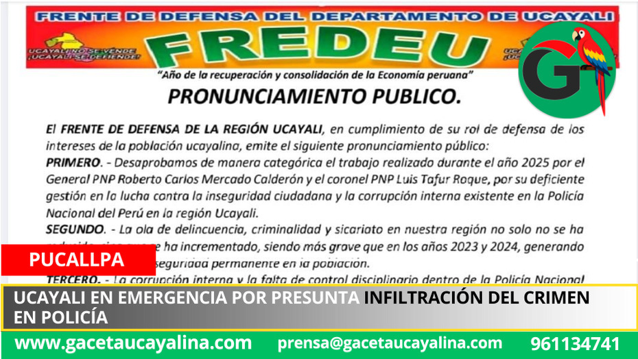 Pucallpa.- La región Ucayali atraviesa una de las crisis de seguridad más graves de los últimos años, situación que ha llevado al Frente de Defensa de la Región Ucayali a declarar un estado de emergencia social y política.