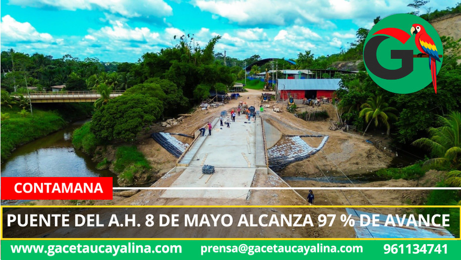 Contamana / Ucayali / Loreto.- El puente del Asentamiento Humano 8 de Mayo registra un 97 % de avance físico, consolidándose como una de las obras de infraestructura más importantes para la mejora del tránsito y la calidad de vida de los vecinos del sector.