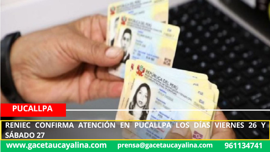 Reniec confirma atención en Pucallpa los días viernes 26 y sábado 27