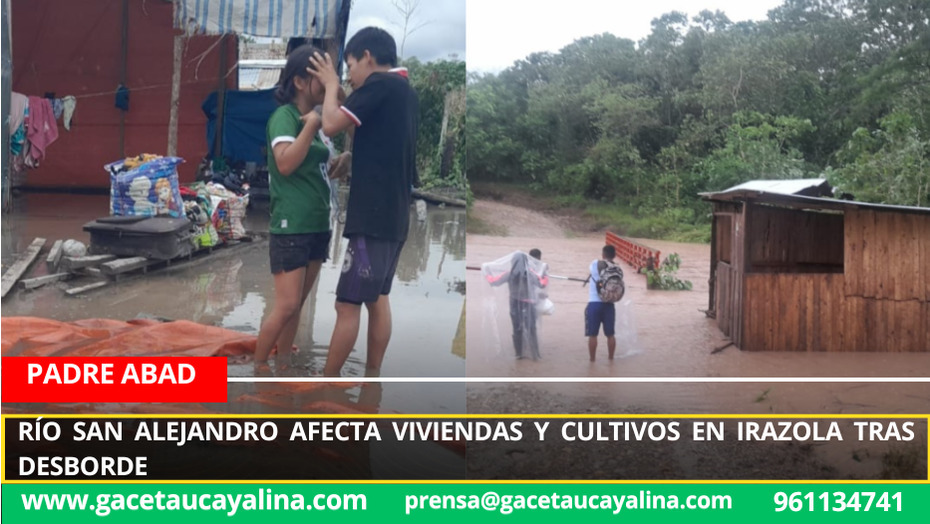 Padre Abad.- El súbito desborde del río San Alejandro, afluente del río Aguaytía, provocó serias afectaciones en viviendas, cultivos, caminos y puentes en el distrito de Irazola, provincia de Padre Abad. El evento se registró con mayor intensidad en los caseríos Playa Bella y San José, donde decenas de familias resultaron perjudicadas.