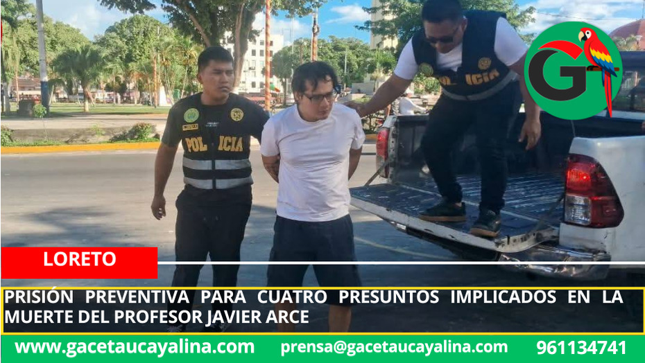 El Poder Judicial, a través de la Corte Superior de Justicia de Loreto, declaró fundado el requerimiento de prisión preventiva por el plazo de doce meses solicitado por el Ministerio Público contra cuatro personas presuntamente involucradas en la muerte del profesor Javier Arce, un caso que ha generado gran atención pública y continúa en etapa de investigación.