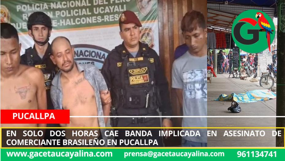 Pucallpa.- En una rápida y efectiva operación policial, la Región Policial de Ucayali logró capturar en tiempo récord a tres presuntos implicados en el asesinato del comerciante brasileño Raimundo Nonato Braga De Andre (30), ocurrido la mañana de este lunes en la avenida Alfonso Ugarte, en pleno centro de la ciudad de Pucallpa.