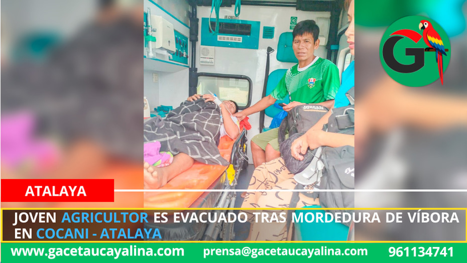 Atalaya.- Un joven agricultor de 23 años, identificado como Alexis Chovingo Zantiri, fue trasladado de emergencia al Hospital Intercultural de Atalaya tras sufrir la mordedura de una víbora conocida como jergón, mientras realizaba labores agrícolas en su chacra, ubicada en la localidad de Cocani, en la provincia de Atalaya.