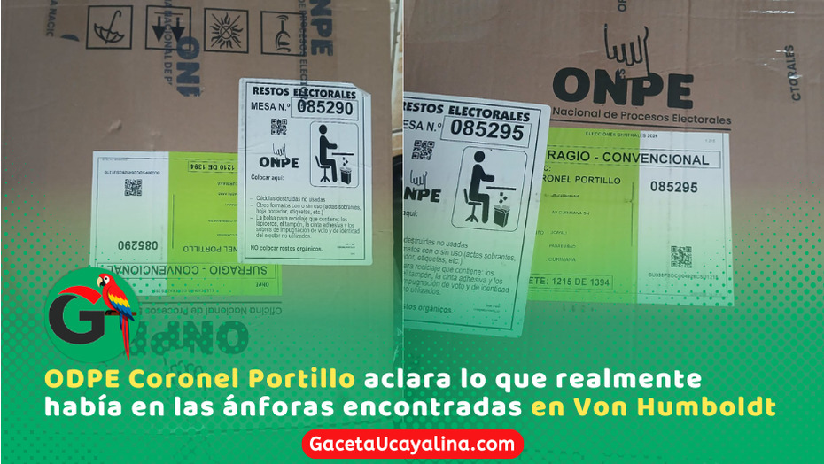Pucallpa.- Ante una publicación difundida en nuestro Medio de Comunicación Digital "Gaceta Ucayalina", la Oficina Descentralizada de Procesos Electorales (ODPE) Coronel Portillo emitió un pronunciamiento oficial para aclarar el presunto hallazgo de cuatro ánforas de votación con material electoral en el distrito de Alexander Von Humboldt, descartando cualquier irregularidad relacionada con votos no contabilizados o manipulación de resultados.